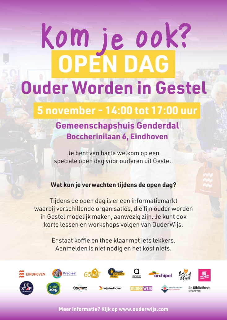 Op woensdag 5 november van 14:00 tot 17:00 uur ben je van harte welkom in Gemeenschapshuis Genderdal (Boccherinilaan 6, Eindhoven) voor de open dag Ouder worden in Gestel georganiseerd door OuderWijs. Een gezellige én informatieve middag voor alle ouderen uit de wijk.